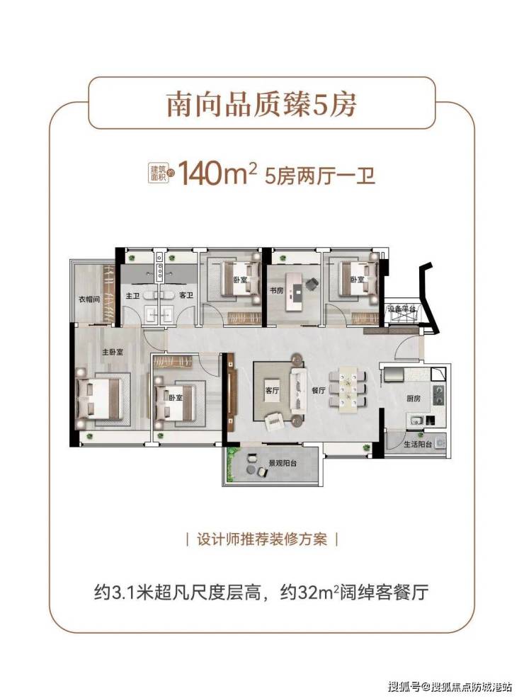 项目户型涵盖107-268㎡三至五房,从刚需改善到终极置业全覆盖,均采用LDKG 一体化设计、全南向布局、双主套设计,空间利用率极高,得房率达91%-95%,远超行业平均水平。其中,268㎡旗舰户型采用3T2 户设计、专梯入户、保姆梯分流,270° 全景飘窗、近 50㎡主卧套房,尽显高端居住质感。