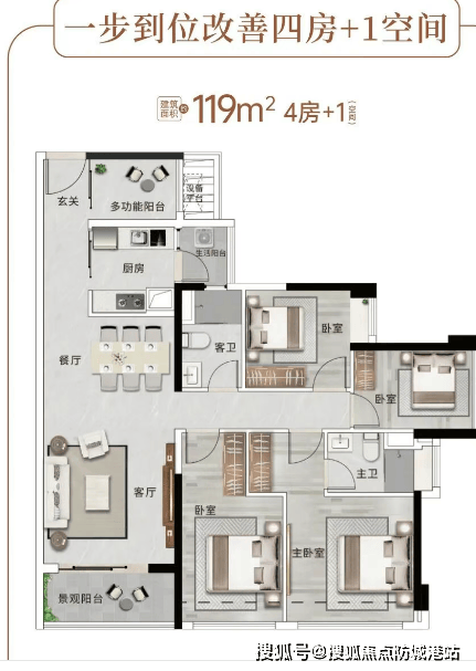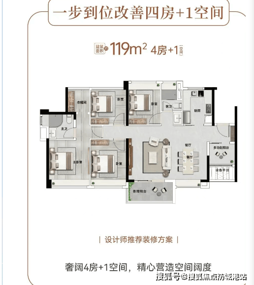 107㎡三房两厅两卫:全南向布局,LDKG 一体化大方厅,约 6.5 米观景阳台,主卧套房带独立卫浴,得房率 91%,适合年轻家庭首次置业;