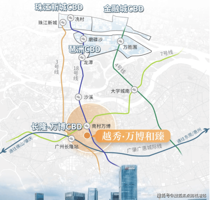 项目所在的万博CBD是广州重点发展的国际级城市副中心,享有极佳的交通优势。距离项目约800米的南村万博站是地铁18号线的重要枢纽,未来还将与地铁3号线和7号线实现换乘,形成三地铁交汇的交通体系。从项目出发,一站直达琶洲,二站到冼村,通达珠江新城核心区仅需数分钟,大大缩短通勤半径。同时,项目周边的华南快速、新光快速、番禺大道等多条快速路网环伺,自驾可快速抵达广州南站,连接大湾区其他主要城市。对于需要跨城出行的业主而言,这种轨道加高速的双重交通体系,兼顾效率与便捷,既满足日常工作需求,也为长途出行提供可靠保障。