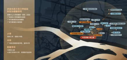 项目内部规划了购物中心、总部办公、高端住宅、康养中心、生态公园等多种功能区,致力于打造一个宜居宜业的城市综合体。周边拥有宜家家居、山姆会员店、美林M·LIVE天地购物中心等大型商业设施,满足居民日常生活所需。医疗方面,紧邻中山一院东院、广州医科大学附属第五医院等多家优质三甲医院,保障居民健康。此外,蟹山公园、瓦壶岗公园、狮山公园等自然景观环绕,1.2公里滨水景观长廊更是增添了居住的舒适度。