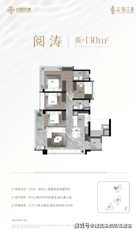 中交四航·珠江春位于老黄埔的心脏区域——鱼珠CBD,总建筑面积约92万平方米,容积率为4.49,规划有1490席住宅单位,配备2450个车位,绿地率不低于35%。首推产品主要集中在融资区3号地块的6#、7#和8#栋,均为超高层建筑,梯户比为3梯3户或3梯4户。作为由万亿国匠中交集团旗下的中交四航局开发的战略作品,该项目是一座集购物中心、总部办公、高端住宅、配建学校/幼儿园、康养中心、生态公园等多种功能于一体的CBD港湾综合体。