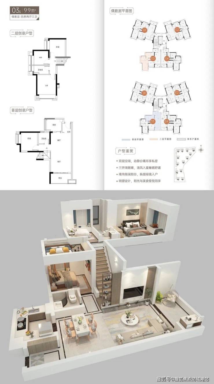 南北通透全明户型,宽阔尺度空间,上下两层,私密性更强,复式高使用率让居住更惬意!最宽楼距可达105米,约99-121㎡全南向复式四房,全屋国际一线品牌精装,还配置带藏光镜柜、感应小夜灯、智能门锁、门口小挂钩等贴心功能设施,片区内的最高装修标准。