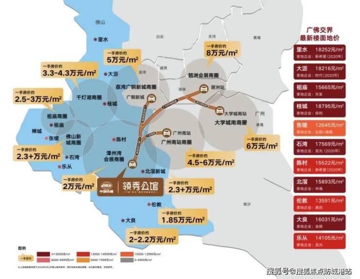 项目去番禺仅约30分钟,售价却为万博中心1/3,祖庙1/2,千灯湖1/3,处于价格洼地,距离直径5公里地块楼面地价已达1.88万/㎡,片区新房均价2.4万/㎡,项目距离北滘新城、佛山新城5km,车程约20分钟,价差80-100万,未来溢价不言而喻。