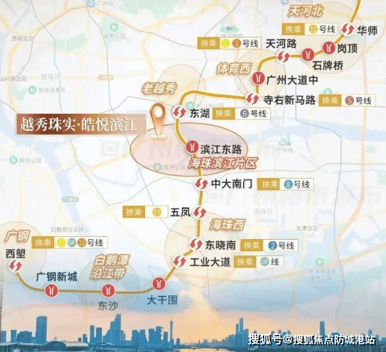 皓悦滨江位于广州市海珠区,地处老城区核心地带,紧邻珠江新城,直线距离仅为3.5公里。项目周边交通网络发达,通过江湾大桥直连越秀区,瞬达天河等区域。尽管地块不直接临近地铁站,但最近的2号线市二宫站和10号线滨江东站均在步行或短途接驳范围内,提供了便捷的公共交通出行条件。