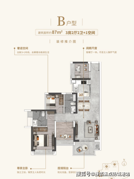 87㎡ | 3房·2厅·2卫+1空间:经典竖厅设计,动静分明,三开间朝南,引阳光清风入室,主卧套房设计,尊享私密天地。