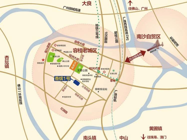 它位于容桂中心城区核心位置,距离容桂客运站仅1公里,并且毗邻桂洲大道、105国道,直达广珠西线高速、佛山一环,距珠海及广州车程约1小时;同时可通过广珠城轨畅达广州、珠海,未来项目周边将规划有佛山地铁3号线(桂洲大道站)。