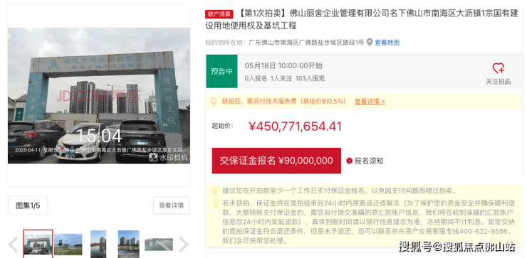 近日,佛山丽舍企业管理有限公司名下佛山市南海区大沥镇1宗国有建设用地使用权及基坑工程上架京东法拍平台,起拍价450,771,654.41元,将于5月18日进行网拍。