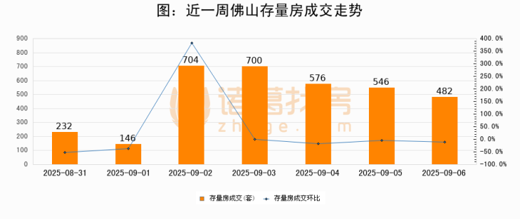 从存量房来看,2025年09月06日佛山存量房单日成交482套,比昨日减少64套,环比下降11.7%。从近一周存量房成交来看,佛山存量房日均成交套数为483套,09月06日单日成交482套,低于近一周平均水平0.2%。