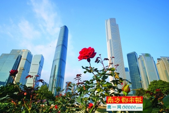 广州花城广场的红玫瑰,在蓝天映衬下更显艳丽。