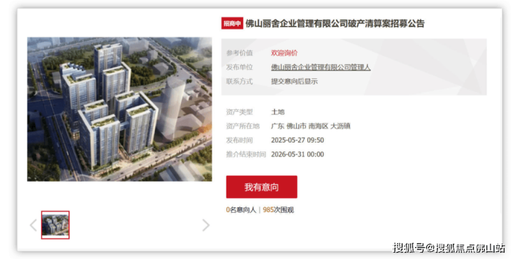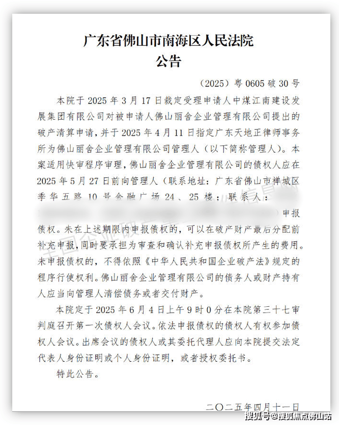 公告显示,今年年初,南海区人民法院裁定受理丽舍企业破产清算,现管理人依法公开招商引资。