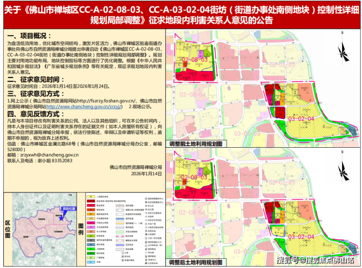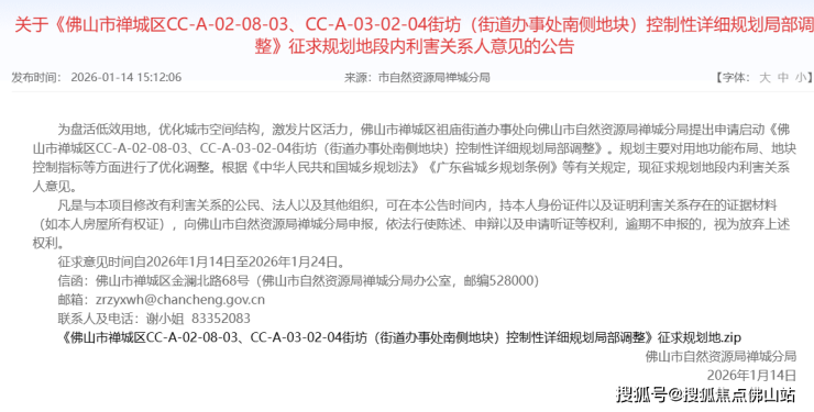 1月14日,佛山市自然资源局禅城分局发布关于《佛山市禅城区CC-A-02-08-03、CC-A-03-02-04街坊(街道办事处南侧地块)控制性详细规划局部调整》征求规划地段内利害关系人意见的公告。