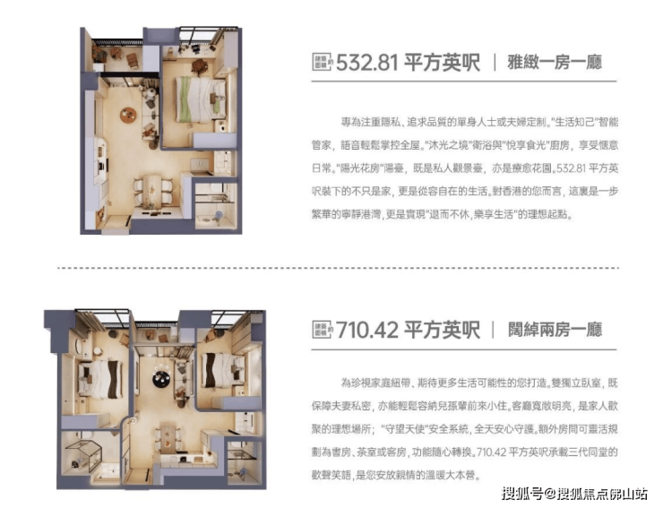 其推出的户型有532.81平方英尺的一室一厅、710.42平方英尺的两室一厅,折合约为49.5㎡和66㎡。