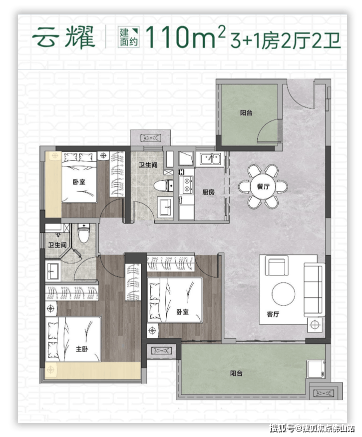 110㎡3+1户型,东南朝向,与105㎡不同的是竖厅设计,厨房连接餐厅,阳台同样有约2米面宽。
