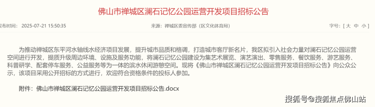 7月21日,禅城区委宣传部发布“佛山市禅城区澜石记忆公园运营开发项目招标公告”。