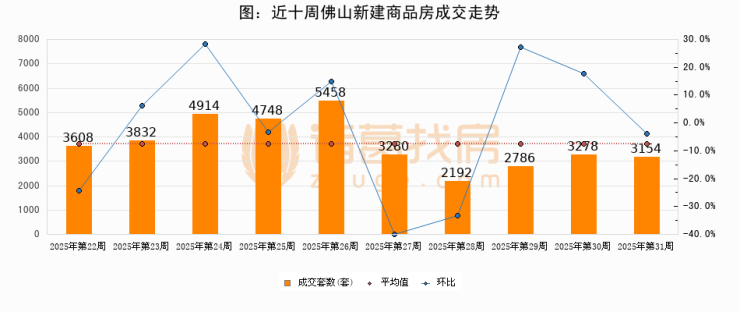 进入2025年第31周(07月28日-08月03日),佛山新建商品房成交3154套,较上周减少124套,环比下降3.8%。从近十周成交来看,周均成交套数为3725套,本周成交3154套,低于近十周平均成交量15.3%。