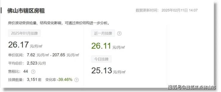 中国房价行情网显示,2025年1月 ,佛山租金平均单价为26.17元/㎡·月 ,环比上涨0.67%。
