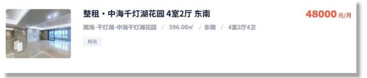 中海千灯湖花园一套396㎡的四房,不带家具,每月租金高达4.8万/月,平均约121元/㎡·月 。