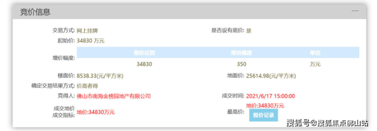 回溯至2021年,佛山市南海金榜园地产有限公司以3.48亿斩获该项目所在地块,楼面价约8538元/㎡。