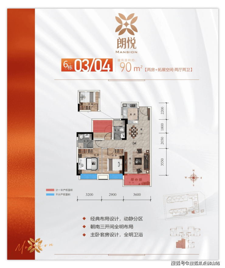 其中90㎡三房两卫,三开间朝南,动静分区明确,厨房为U型设计。