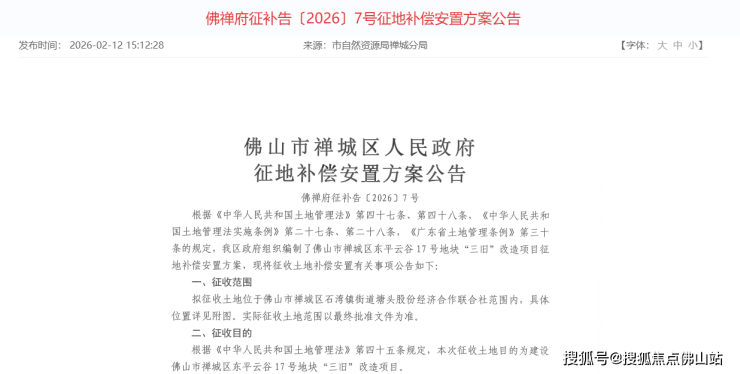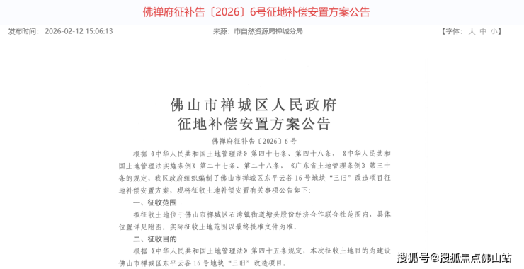 2月12日,佛山市自然资源局禅城分局发布两则征地补偿安置方案公告,涉及东平云谷16、17号地块。