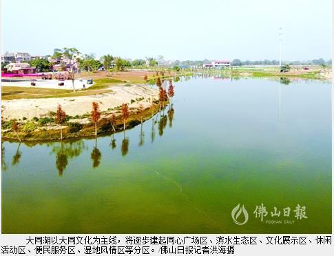 大同湖连通乐平涌、西边涌、左岸涌等主要水系,提升全镇水环境的调度能力,成为城中的生态绿肺。大同湖以大同文化为主线,将逐步建起同心广场区、滨水生态区、文化展示区、休闲活动区、便民服务区、湿地风情区等分区,大同文化长廊、环形水景、音乐喷泉、亲水平台、花田景观等文化休闲景观也将注入其中。