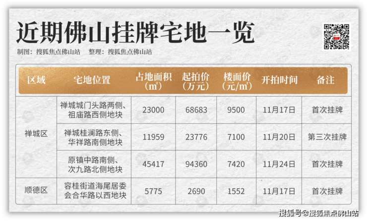 目前有4宗宅地即将开拍,禅城有3宗,顺德有1宗。