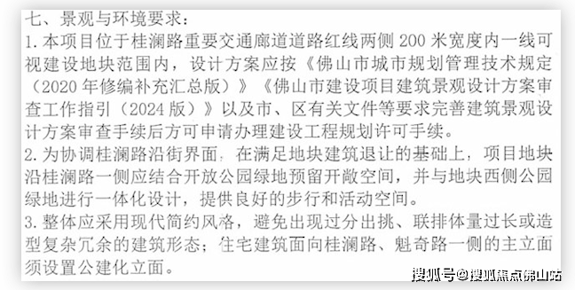 此外,项目地块沿桂澜路一侧应结合开放公园绿地预留开敞空间,并与地块西侧公园绿地进行一体化设计,住宅建筑面向桂澜路、魁奇路一侧的主立面需设置公建化立面。