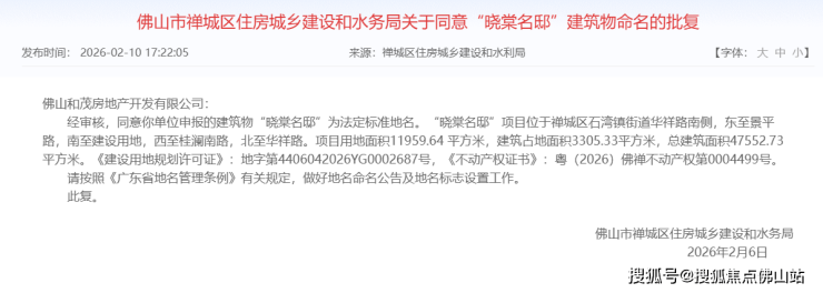 通知显示,同意你单位申报的建筑物“晓棠名邸”为法定标准地名。“晓棠名邸”项目位于禅城区石湾镇街道华祥路南侧,东至景平路,南至建设用地,西至桂澜南路,北至华祥路。项目用地面积11959.64 平方米,建筑占地面积3305.33平方米,总建筑面积47552.73平方米。《建设用地规划许可证》:地字第4406042026YG0002687号,《不动产权证书》:粤(2026)佛禅不动产权第0004499号。