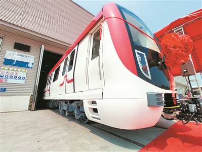 广州日报讯 (全媒体记者李传智摄影报道)昨日,广佛地铁列车增购项目首列车在组装地高明—佛山中车四方轨道车辆有限公司正式下线。此次增购的18列列车预计年底上线,广佛地铁的行车间隔有望缩至3分钟/班。