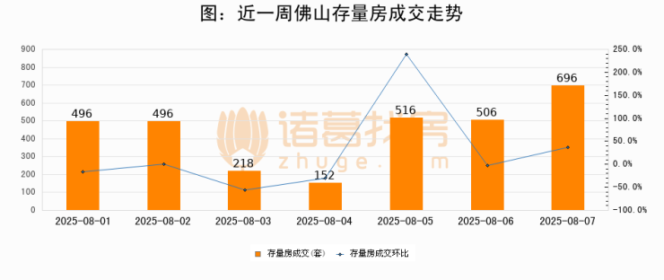 从存量房来看,2025年08月07日佛山存量房单日成交696套,比昨日增加190套,环比上涨37.5%。从近一周存量房成交来看,佛山存量房日均成交套数为440套,08月07日单日成交696套,高于近一周平均水平58.2%。