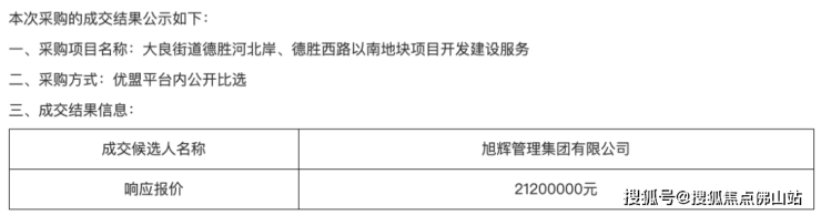 近日,旭辉管理集团有限公司竞得了大良街道德胜河北岸、德胜西路以南地块项目的开发建设服务权,开发建设服务费预算为2120万。
