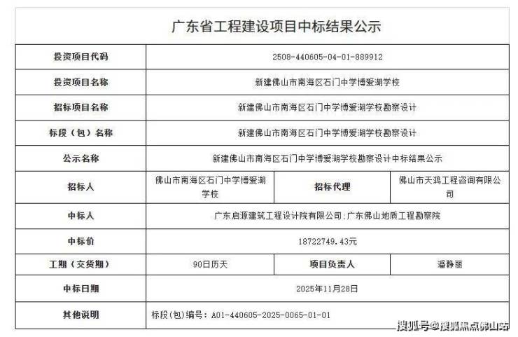 近期,石山中学(博爱湖校区)发布招标结果公示,即将开启勘察设计,工期90天。