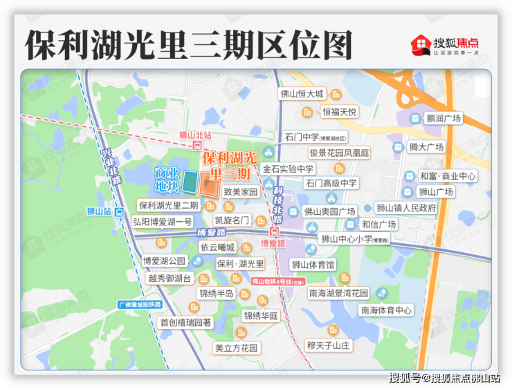 从位置来看,保利博爱湖三期位于博爱湖北边,紧挨着金石实验中学(原石门中学),距离佛山地铁4号线狮山北站(在建中)约300米,周边有佛山奥园广场、狮山中心小学、和信广场、长华万达广场等。
