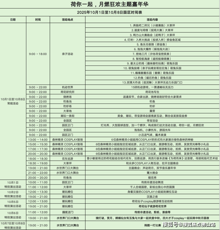 随着开幕日的圆满启动,三水荷花世界正式进入“国庆中秋超级狂欢”模式,将持续至10月8日,为市民游客带来天天有惊喜、场场有新意的假日体验,附上具体活动内容表。