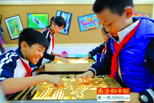 (11月30日上午,小学生们在北滘青少宫体验沙画课程。)