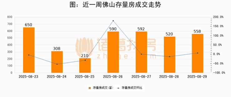 从存量房来看,2025年08月29日佛山存量房单日成交558套,比昨日增加38套,环比上涨7.3%。从近一周存量房成交来看,佛山存量房日均成交套数为489套,08月29日单日成交558套,高于近一周平均水平14.1%。