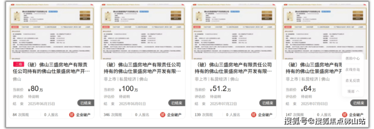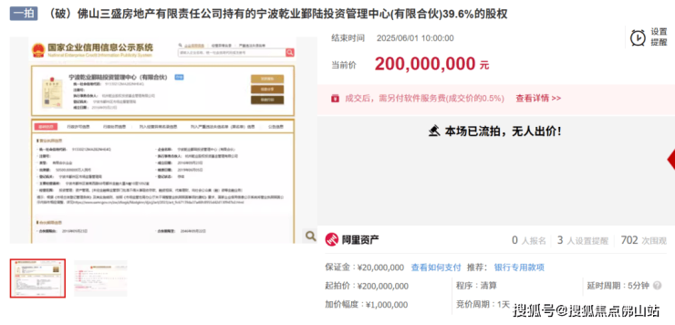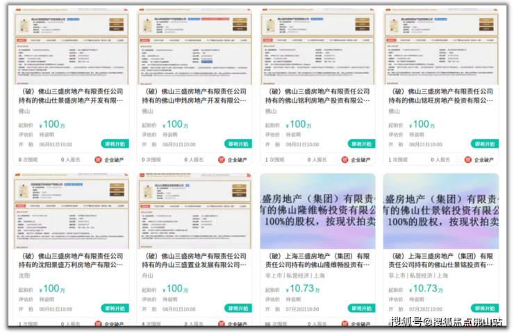 随着三盛宏业债务危机的爆发,其佛山子公司相继宣布破产,持有的股份、债权等登上法拍平台,至少涉及12项资产,但仅有一项成功拍出。