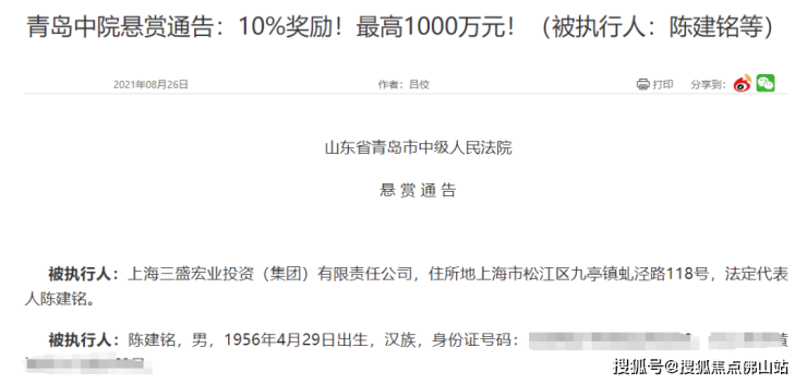 2021年,青岛中院对三盛宏业的实际控制人陈建铭发布悬赏通告,悬赏金最高可以达到1000万。