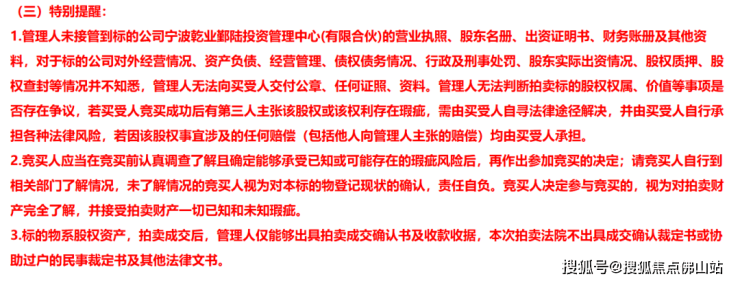 三盛房地产无法判断拍卖标的股权权属、价值等事项是否存在争议,若买受人竞买成功后有第三人主张该股权或该权利存在瑕疵,需由买受人自寻法律途径解决,并由买受人自行承担各种法律风险,若因该股权事宜涉及的任何赔偿(包括他人向管理人主张的赔偿)均由买受人承担。