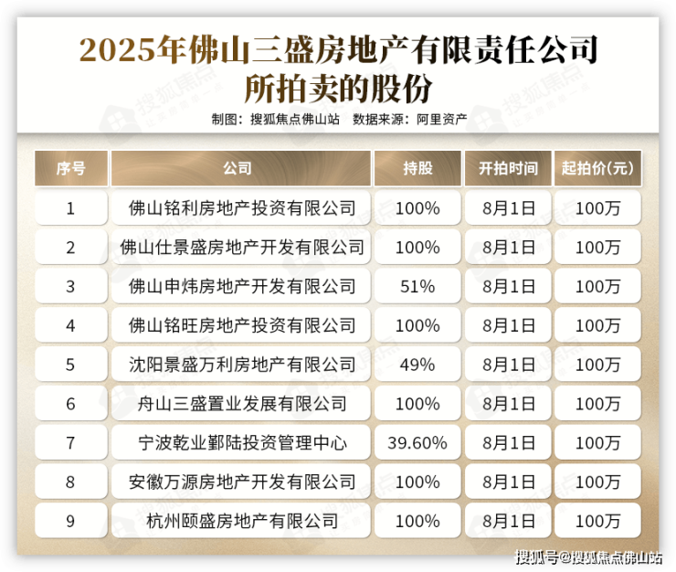 阿里资产显示,佛山三盛房地产有限责任公司持有的9家企业的股权,将于8月1日10:00开拍,起拍价均为100万,评估价则并未标出。