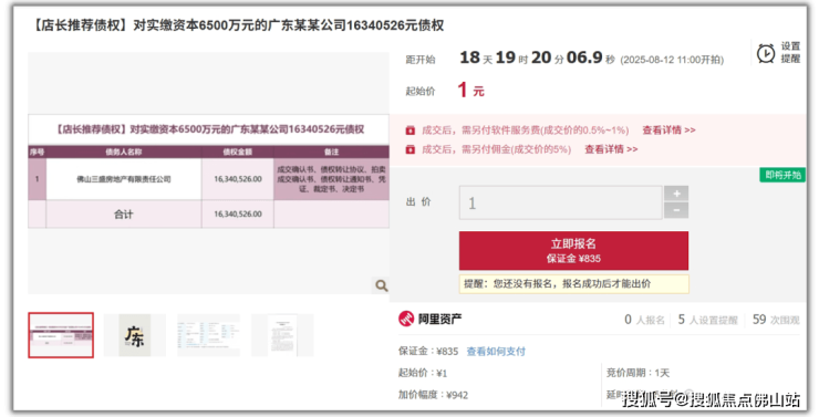 除了股份,佛山三盛房地产的债权也一并进行法拍,应收款金额累计超6371万,部分债权的起拍价为1元。