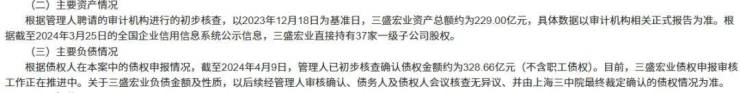 此外,由审计机构初步核查显示,以2023年12月18日为基准日,三盛宏业资产总额约为229亿元;而根据债权人的申报情况,截至2024年4月9日,已初步核查确认债权金额约为328.66亿元(不含职工债权)。