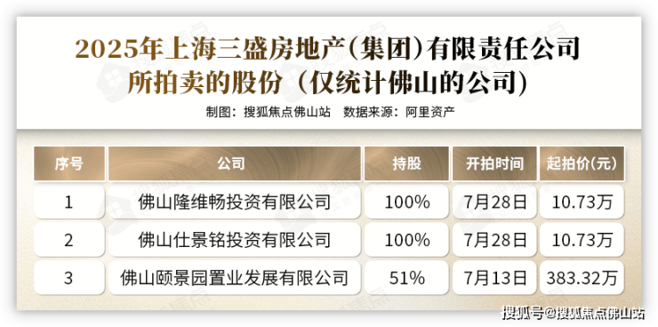 今年,三盛宏业所持有的佛山子公司股份也相继登上法拍平台,其中佛山颐景园置业发展有限公司51%的股权被成功拍出,另外两家则将于7月28日再次开拍,这已经是年内的第10次挂牌。