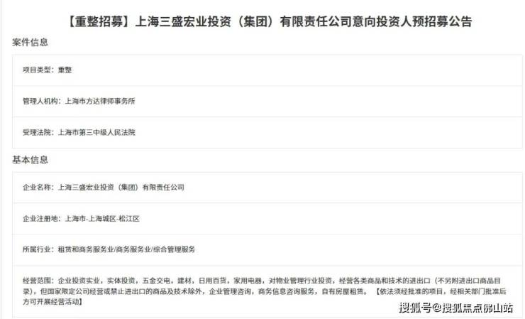 2024年5月末,上海破产法院发布公告称,为了通过市场化机制充分发现和识别三盛宏业的重整价值,管理人公开进行意向投资人预招募,若能顺利推进重整,则三盛宏业有望重新恢复并提升偿债能力、重获新生。