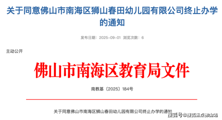 近日,南海区教育局发布关于同意佛山市南海区狮山春田幼儿园有限公司终止办学的通知。