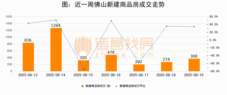 根据佛山市住房保障和房产信息网数据显示,2025年08月19日佛山新建商品房成交368套,较昨日增加94套,环比上涨34.3%。近一周佛山新建商品房日均成交535套。08月19日单日成交368套,低于近一周平均水平31.2%。