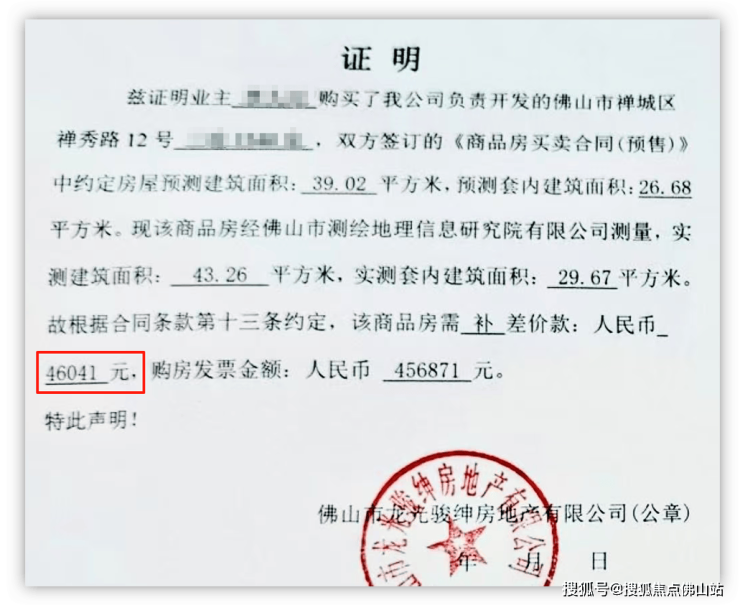 玖龙台业主家园曾发布一篇文章,表示:“在办理房产证时,实际面积和购房合同中的预测面可能积存在出入,会根据实际面积退/补购房款差价。”