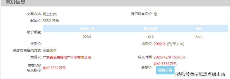 公告显示,地块由广东省泓晟房地产开发有限公司以总价5552万元夺得,折合楼面价约833元/㎡。