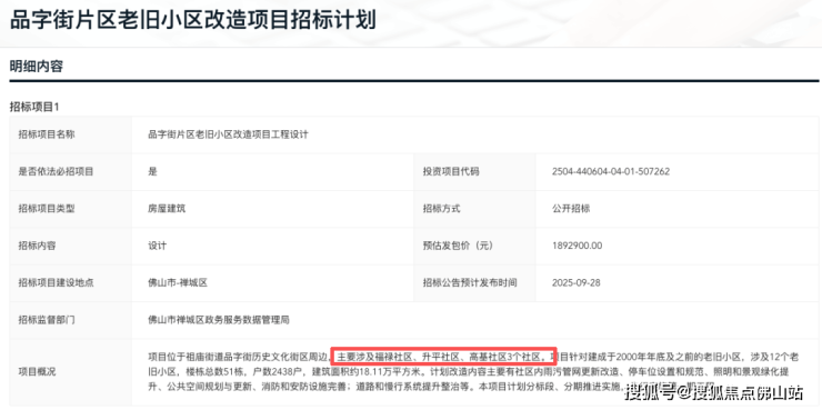 其中禅城品字街片区老旧小区改造项目招标计划显示,该项目主要涉及福禄社区、升平社区、高基社区3个社区。