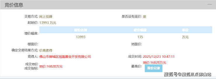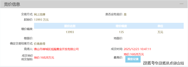 12月23日,佛山市禅城区旭瀚置业开发有限公司以16828万竞得佛山市禅城区科润路北侧、弘德北路东侧地块,折合楼面价约7002元/㎡,溢价率达20.26%。